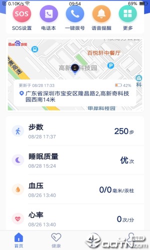 2、健康关爱:关爱老人、随时查看计步、心率、血压等健康数据报表