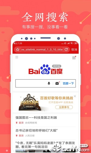 全民浏览器是一款致力于向用户提供有价值内容的浏览器,用户在这里可以快速的搜自己想搜的,看全网的热点事件,浏览贴近用户生活的小视频。