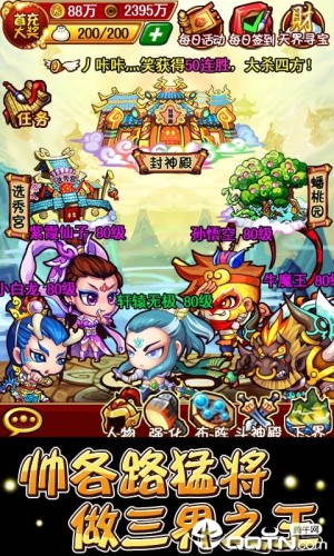 游戏中你可以创建3种不同的职业,稳重结实的武神,凌厉飘渺的斗皇和法力强劲的天师,配合强大的招募收集系统,选择自己中意的伙伴,去完成丰富的任务、挑战强力凶悍的精英BOSS,强化升级更优良的装备和仙器,组成心中最强的梦幻阵容,杀回天界。你是否能拯救天界,平定人间,在千人争霸战中所向披靡呢? 诙谐的文字、Q版有爱的画风、没事种种菜、摇一摇,无需操作的战斗和线下龙珠经验,使得游戏内容不但给力而且轻松,即使没有大块时间,依旧可以在小将的世界里叱咤风云。懂得游戏更要懂得生活,元芳,你觉得呢 ?天朝小将,天朝公民必玩的游戏!