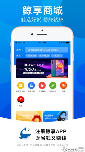 鲸享商城app是一款手机优惠购物商城。自购省钱,分享赚钱,中秋快到了,鲸享超级优惠活动,大牌云集,各类商品超低价格,让你开心购物,乐享中秋。