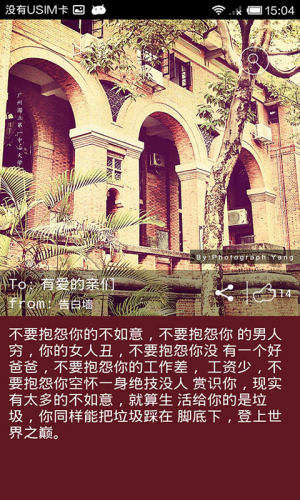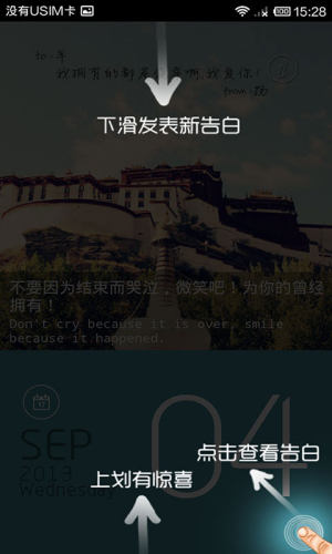 告白墙是一款以时间为线索进行方便告白应用简单精致是告白墙的最大特色,没有繁琐的注册过程,没有花哨的界面,没有复杂的操作流程,只要轻轻触碰手指即可完成操作每天不同的浪漫话语配上精美的图片,直达你的心底,怎么能不让人心动?并且会永久保留你对ta的告白,还在等什么,赶紧来试试这款最简单、最精美的告白神器告白墙吧!