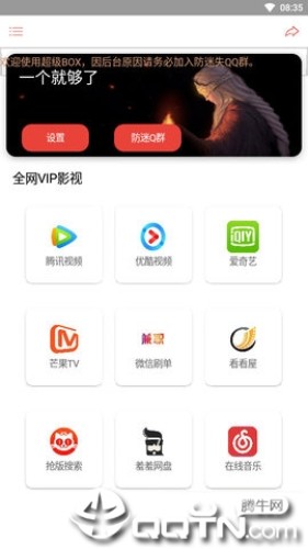 超级BOX是囧大的原创软件,仅4M大小,就能免费看:腾讯视频,优酷视频,爱奇艺,芒果TV,美剧侠,看看屋,抢版搜索。界面清新,使用流畅,测下来速度很快不卡,推荐使用。