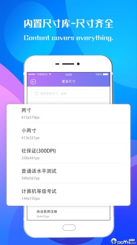输入关键字,智能搜索你想要的规格尺寸;一寸照、二寸照、学生证件照、考试证件照照、工作证件照......海量尺寸,规格齐全,是你拍证件照的首选