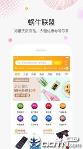 蜗牛联盟可以查看淘宝、天猫的商品优惠券并支持分享给朋友,超高购物返佣,百万大额优惠券每日海量更新,真正给用户省钱还能赚钱的APP。