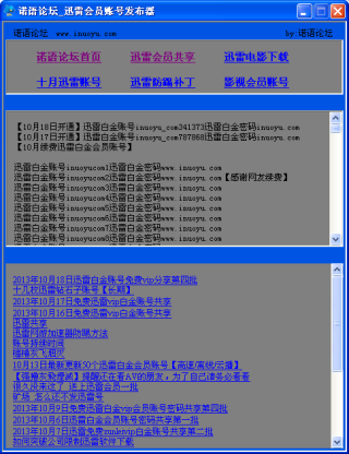 点开即可获取每天开通的最新迅雷白金会员账号;是诺语论坛官方出品、使用C#语言编写;每天更新开通最新迅雷白金会员;点击即可查看最新可用的账号