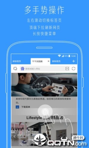 2.多手势操作的支持,通过左右滑动网页可以进行标签与网页的切换,网页浏览到达顶端时支持下拉刷新,长按网页内容的任一位置弹出快捷功能菜单。