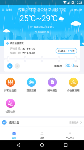 掌上施工app,施工工程管理工具,支持沥青运输、随车报告、试验检测、搅和站监控、通知公告查看等功能,还能随时查看最新天气状况,轻松管理施工项目。