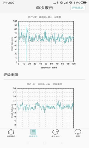 登录app后可以连接终端设备,实时监控心率、平均心率、呼吸率、平均呼吸率、翻身、离床等数据并展示,保存数据后,