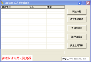 C盘清理工具增强版能够清理电脑系统垃圾。C盘清理工具增强版可快速扫描清理清理系统垃圾和IE缓冲,是BOO软件屋制作的C盘优化清理工具。