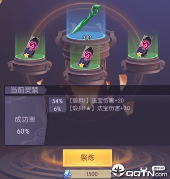 祭炼消耗1至3张灵禁符与灵石,将灵符上的灵禁附加在法宝上。灵禁符上可能记录着不同的灵禁,并且每次祭炼都有一定概率失败。