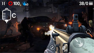 3、屏幕右侧是操作枪械的按钮,上方用来装弹,下方是开火,左边有医疗包和手榴弹。左右移动枪械来调整视角,精准击中丧尸。