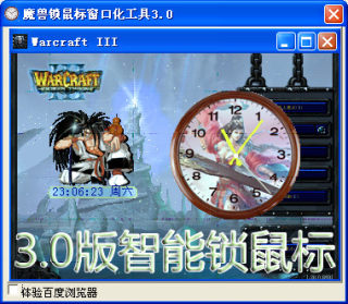 1.圆形窗口模拟电脑桌面时钟,这个时钟运行在魔兽窗口上面,在菜单中选择锁定war3鼠标移动范围又能随时掌握时间,工作娱乐两不误,最新版本提供智能锁鼠标和手动锁鼠标两种方式,方便好用。