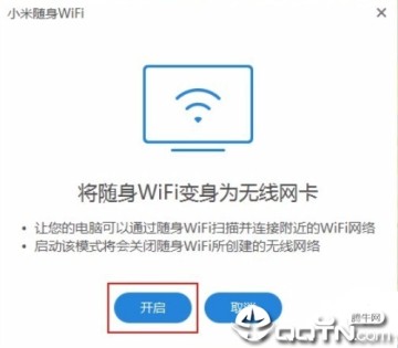 2、然后退提示您小米WiFi变身为无线网卡,点击【开启】就可以了。