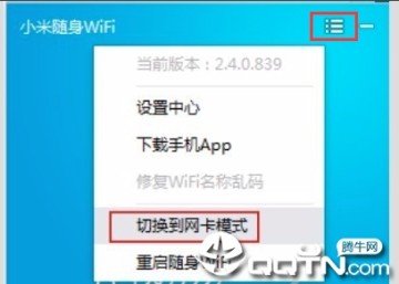 1、打开在本站下载的小米WiFi,打开软件后,点击软件顶部的三个横杠图标。在弹出的选项中点击【切换到网卡模式】。