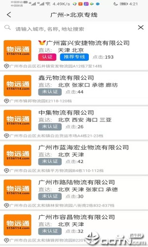 用户可以用手动搜索或语音搜索对出发地和目的地,进行专线查询、落地仓储、物流服务。