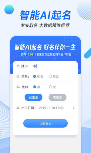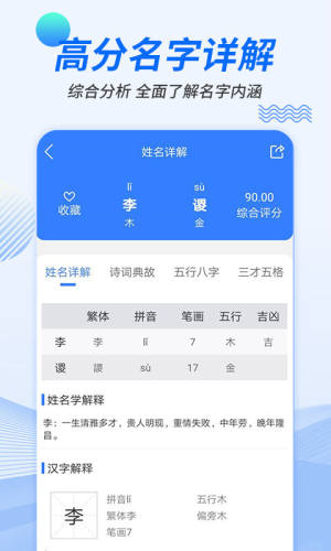并结合诗词典故、三才五格、五行八字、流行趋势、字形结构等因素对名字进行详细解析,旨在起一个最适合宝宝的高分美名。2019年新生儿起名必备软件来啦!轻松取名不再愁!