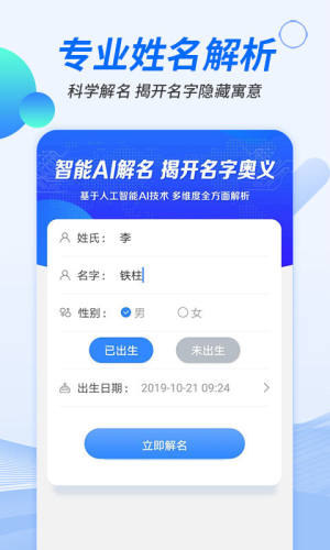 起名取名宝2019是一款专业的取名工具。这里根据你的生辰八字,结合趋势,利用ai技术取出一个好名字,还能给你的名字打分。使用简单方便,感兴趣的朋友快来下载体验吧。