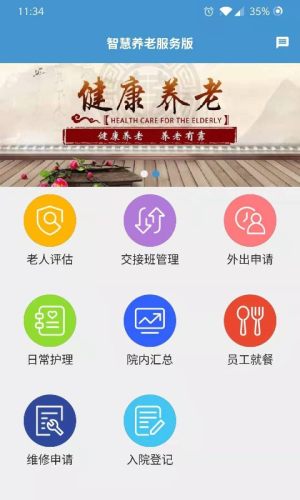 智慧养老服务版是一款集老人评估、老人登记、外出申请、日常护理、员工就餐、维修申请、审批等多功能为一体的app,用于养老社区机构/养老院日常服务,旨在更方便服务养老院/老人。