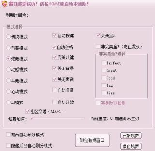 3.启动游戏后,开启辅助,然后登陆会员,勾选好设置,点击绑定游戏窗口,拖动十字光标绑定到炫舞2的游戏窗口,点击绑定游戏窗口,显示成功,即可点开始跳舞开始游戏。无需开始跳舞再开启,自动检测是否处于跳舞模式!