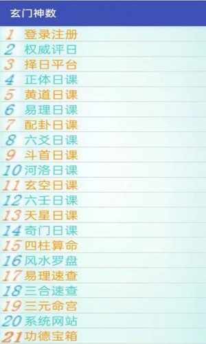 包含:权威评日、正体日课、黄道日课、易理日课、配卦日课、六爻日课、斗首日课、河洛日课、玄空日课、六壬日课、奇门日课、四柱算命、风水罗盘、易理速查、三合速查、三元命宫查询、系统网站、系统资讯等;