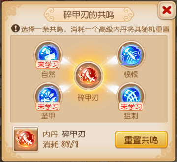 共鸣达到4条时,可以选中1条进行随机重置。随机重置共鸣也需要消耗1个同种高级内丹。