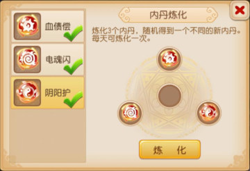 在内丹炼化界面左侧,选中3个准备炼化的内丹,点击"炼化"按钮,3个被炼化的内丹就会消失,得到1个新的内丹。
