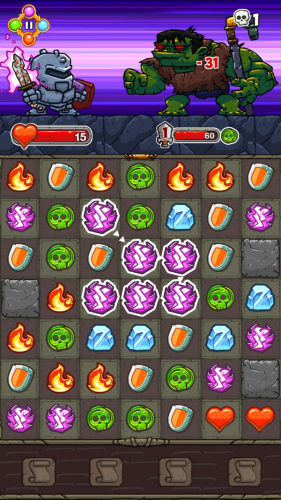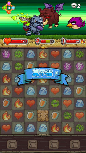 3.玩家通过消除地下城底部的装备来给RPG人物输送各种技能和buff来提升人物的战斗力。