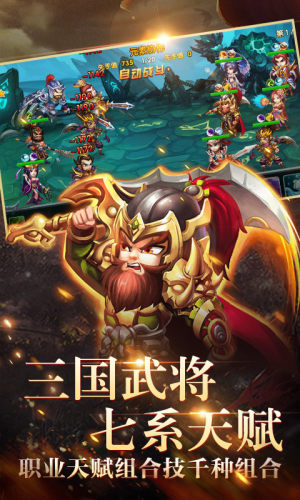 游戏采用Q版的人物设计,玩家可以收集自己喜欢的三国英雄人物,丰富的关卡设计,海量的副本玩法,所有的故事情节都取决于真实的三国历史,不仅可以感受刺激的国战,还可以感受到无限的激情,还有挂机玩法等你来体验。