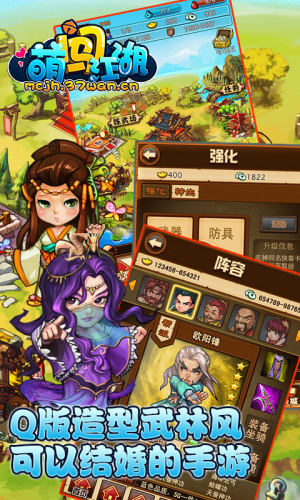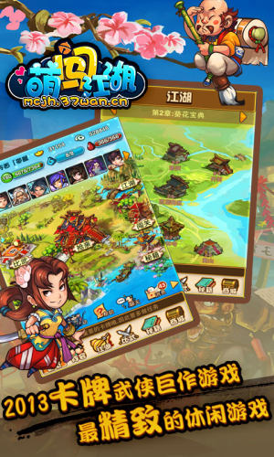 《萌闯江湖》是一款纯休闲的Q版武侠主题游戏,拥有精致的卡通侠客,动听的古风音乐,独创的特色玩法,以及昔年不绝于口的江湖大侠、神兵利器和绝世神功,随手一点,让你轻松体验江湖中的儿女情长!顶级配乐,唯美画面,绝美卡牌,上传照片,社区交友,抢亲闯关,喝酒比武,快意恩仇,这是一个武侠世界,又不仅仅是武侠世界!相信每个人心中都有一个武侠梦,那《比武招亲》将让你的2013刻骨铭心!