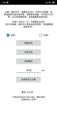 MIUI11快充app,一款小米手机充电神器。下载软件后按照方案设定,可以实现所有MIUI11手机亮屏快充,边玩边充电,再也不用担心电量问题。