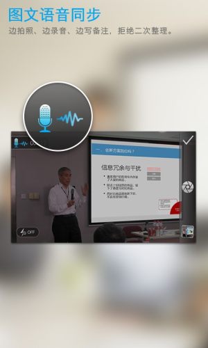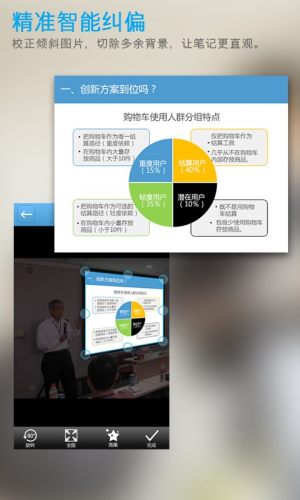 ArcNote商务相机是一款自动抓取幻灯片、白板、纸质文件等内容的必备利器,主要针对商务人士和高校学生,能够智能纠正倾斜图片,录制语音并瞬间生成电子文档。方便你记录会议、培训、课堂的要点和精彩瞬间。