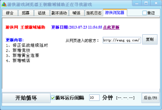 游侠王朝霸域辅助能够自动管理封地、自动招募将士、自动征战以及自动喊话,是网页游戏QQ王朝霸域的辅助工具。