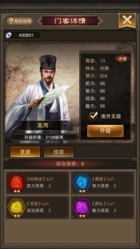 门客需要注意资质和技能等级,这两个可谓是门客战斗力的主要来源。