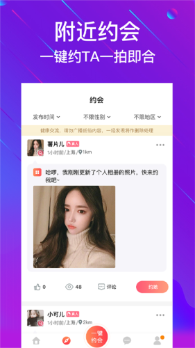 【附近约会】线上看照片,连麦沟通;线下开展约会。