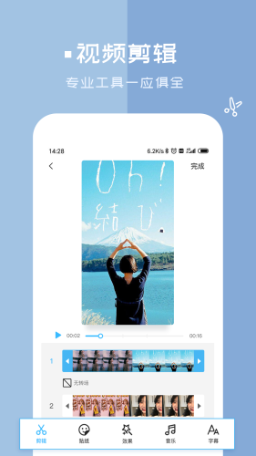 强大的视频编辑功能,丰富的音乐库和海量的视频模板,让你在手机上就能轻轻松松完成视频编辑和视频创意,制作出令人惊艳的趣味视频,不论是vlog视频制作,照片视频电子相册,还是音乐剪辑mv,都可以轻松处理。