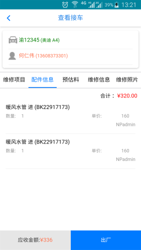 该应用提供给维修企业在移动端进行接车、客户查询、配件/项目查询等功能,