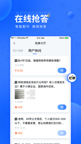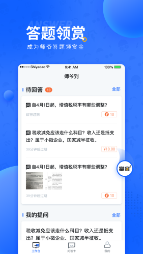 【在线抢答】成为平台认证师爷后,将通过智能匹配,给您推荐最擅长解答的财税领域问题,师爷通过碎片化时间,自由在线抢答,通过专业的答疑获取相应奖赏!