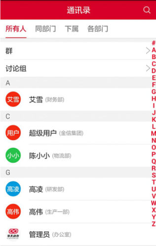 6.通讯录:可以查看系统的公司通讯录,并且可以查看通讯录中任一人员的详细信息,并且可以自动识别电话号码进行打电话。