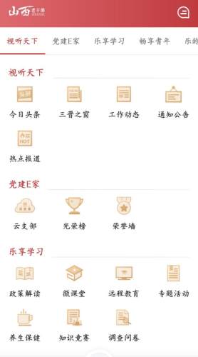 视听天下、党建e家、乐享学习、畅享耆年、乐龄活动、惠享生活、个人中心。