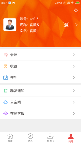 可进行个人信息设置,以及会议,收藏,签到,群发通知,云空间,在线客服等入口