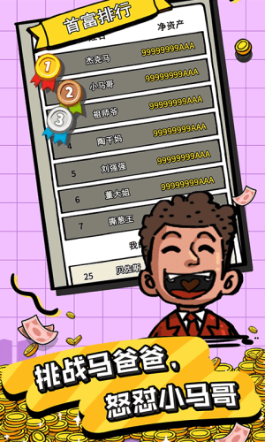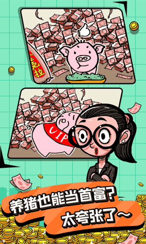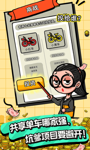 首富特烦恼内购版是提供无限金币的版本,各种风口浪尖的行业都可以轻松驾驭。游戏中各种突发事件让你赚足了钱,共享单车业务,养猪业务更是爆笑无厘头。所以有了无限金币福利,该游戏玩起来更轻松。