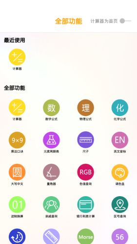 全能生活助手APP是用户生活上的好助手,包含调色盘、各科目常用公式、单位换算、元素周期表、英语音标、区号查询、中国历史等。还可化身尺子、量角器等常用工具。