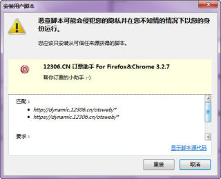 正常情况下,Scriptish会弹出下列的安装提示,请点击『安装』继续;如果没有这样的提示框而是看到了下载或一堆『乱码』,那么请检查是否成功安装了Scriptish扩展。