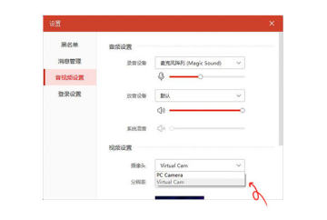 2、VV音乐电脑客户端,进入直播页面,点击左下角的【音视频】设置,点击音视频设置,并在设置摄像头位置选择【Virtual Cam】选项,即成功开启MVBOX直播伴侣;
