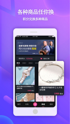 用户可以通过APP内自带模板做任务赚取积分并兑换实物或服务;