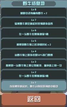 目前每种动物都有共8个技能,以野牛为例,Lv 1当你跳起时,地图中其他野牛会向你的位置靠拢,这可以降低换乘时的失误可能;Lv 2可以在同一只野牛身上骑乘更多时间,让野牛不那么容易狂暴;Lv 3可以让野牛获得冲刺技能,在换乘时拥有短暂的无敌时间……经历过这些升级后,野牛的可用性明显会大大提高。