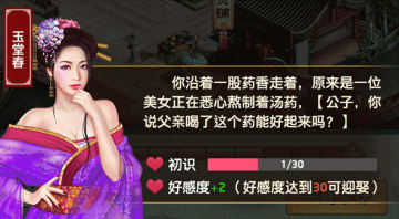 3.美人相伴,夜夜笙歌:玩家在游戏中可以通过剧情或者寻访触发随机事件结识不同的红颜,并且可以跟红颜培养感情,结为夫妻,生下孩子,也可以对子嗣进行教育培养,直至子嗣考取功名,成家立业。让玩家有很强的代入感,体验不同的人生。