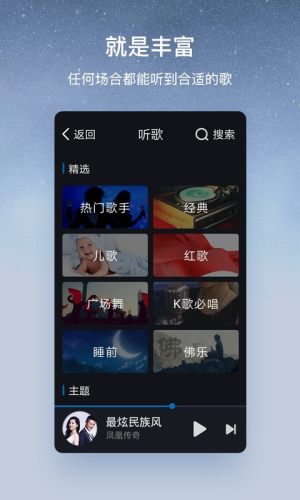 【种类丰富】怀旧时候听听老歌,欢聚时候唱唱红歌,跳舞时候放首舞曲,带娃时候放歌儿歌,失眠时候听个助眠音乐,礼佛时候放起佛乐,任何场景的听歌需求,全都覆盖;