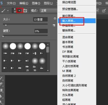 2、打开Photoshop,在工具栏找到画笔工具,或者按快捷键B,点击画笔工具后,在菜单栏的下方会出来画笔工具的状态,点击倒三角按钮,点击设置按钮,选择载入画笔。