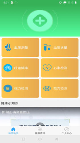其中体检助手,包括常规体检项目,包括:血压测量,血氧含量,呼吸频率,心率监测,视力检测,散光检测,功能强大而准确。